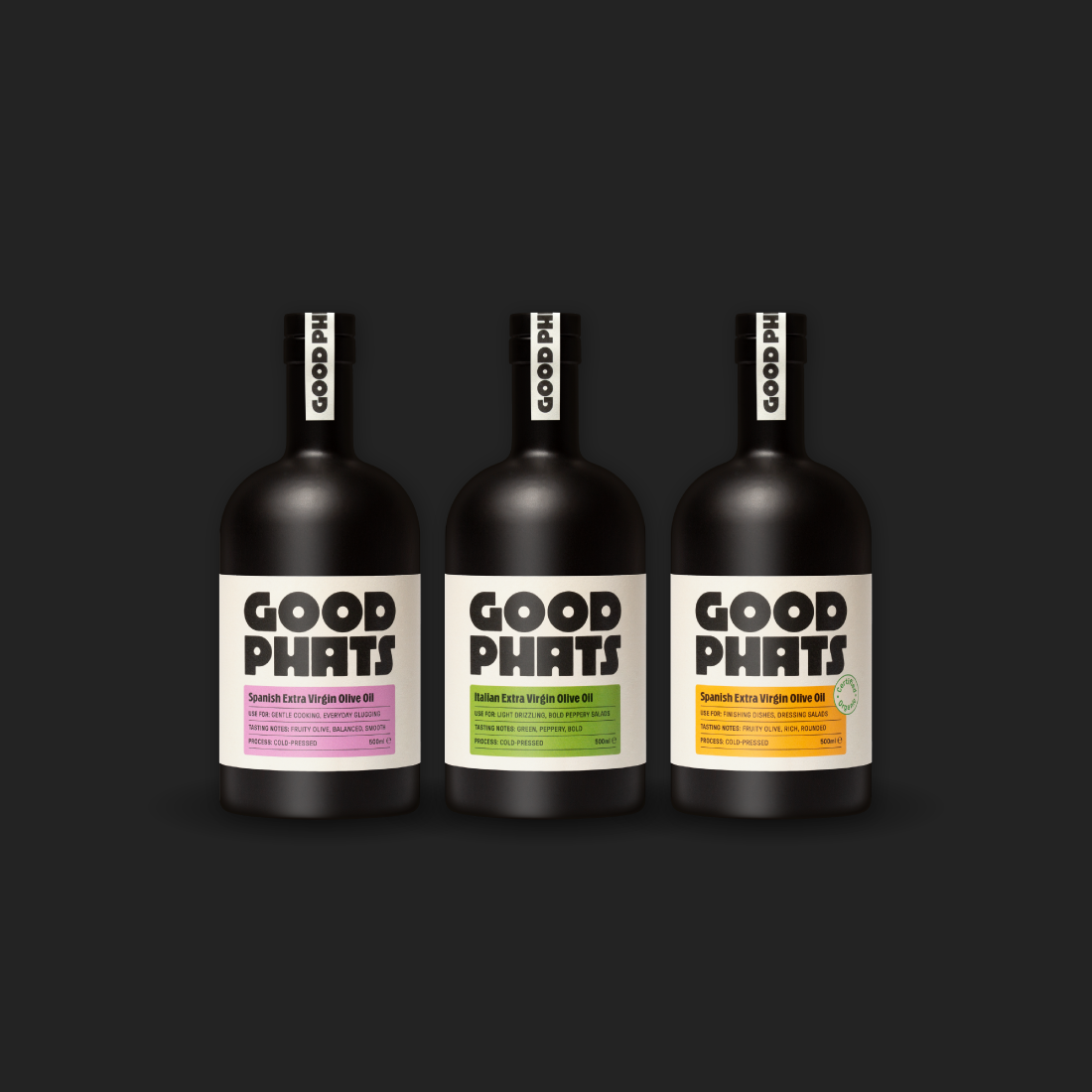 Our GOOD PHATS Extra Virgin Olive Oils Set brings together three of our finest extra virgin olive oils—Spanish, Italian, and Organic—in one must-have collection. This trio is perfect for any kitchen or the ideal gift for the food lover in your life, covering every culinary need with a unique PHAT for every dish.