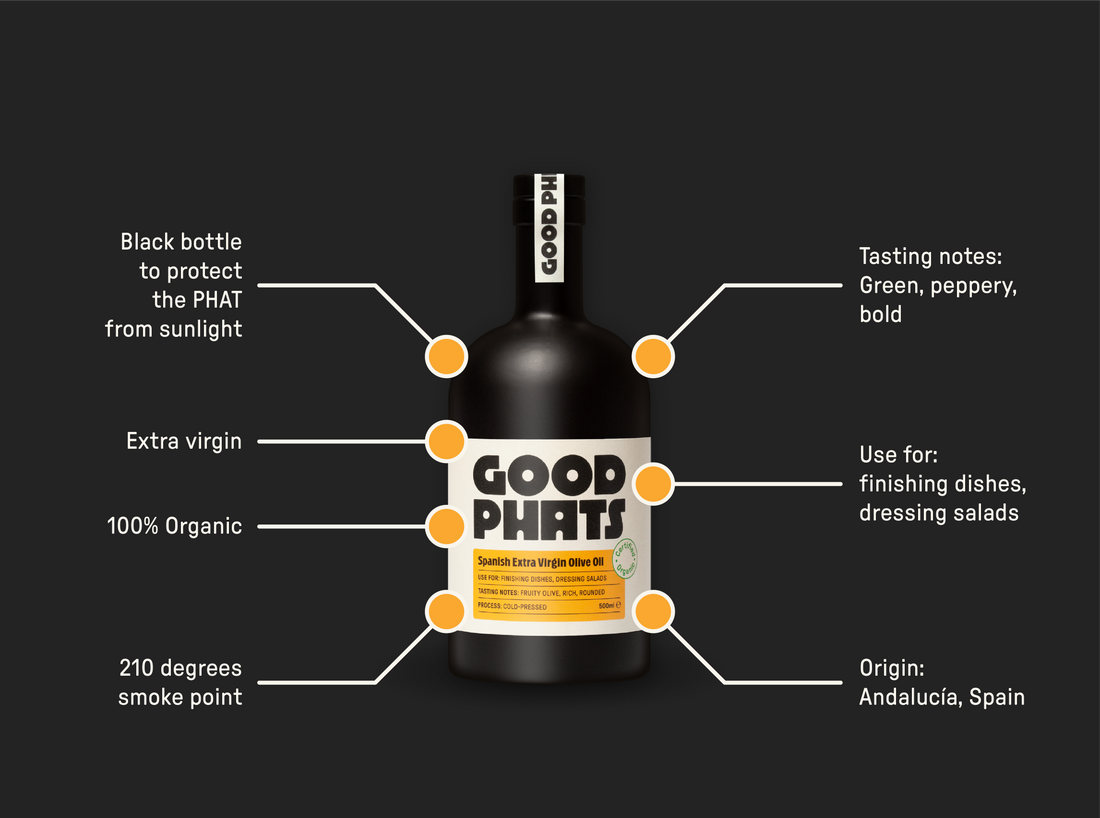 This PHAT is ideal for glugging, drizzling, and finishing. It's rich and fruity, making it perfect for drizzling over grilled veg, pouring over a leafy salad, or finishing your favourite dip. Our Organic Spanish Extra Virgin Olive Oil is a must-have for any food lover seeking unadulterated pleasure.