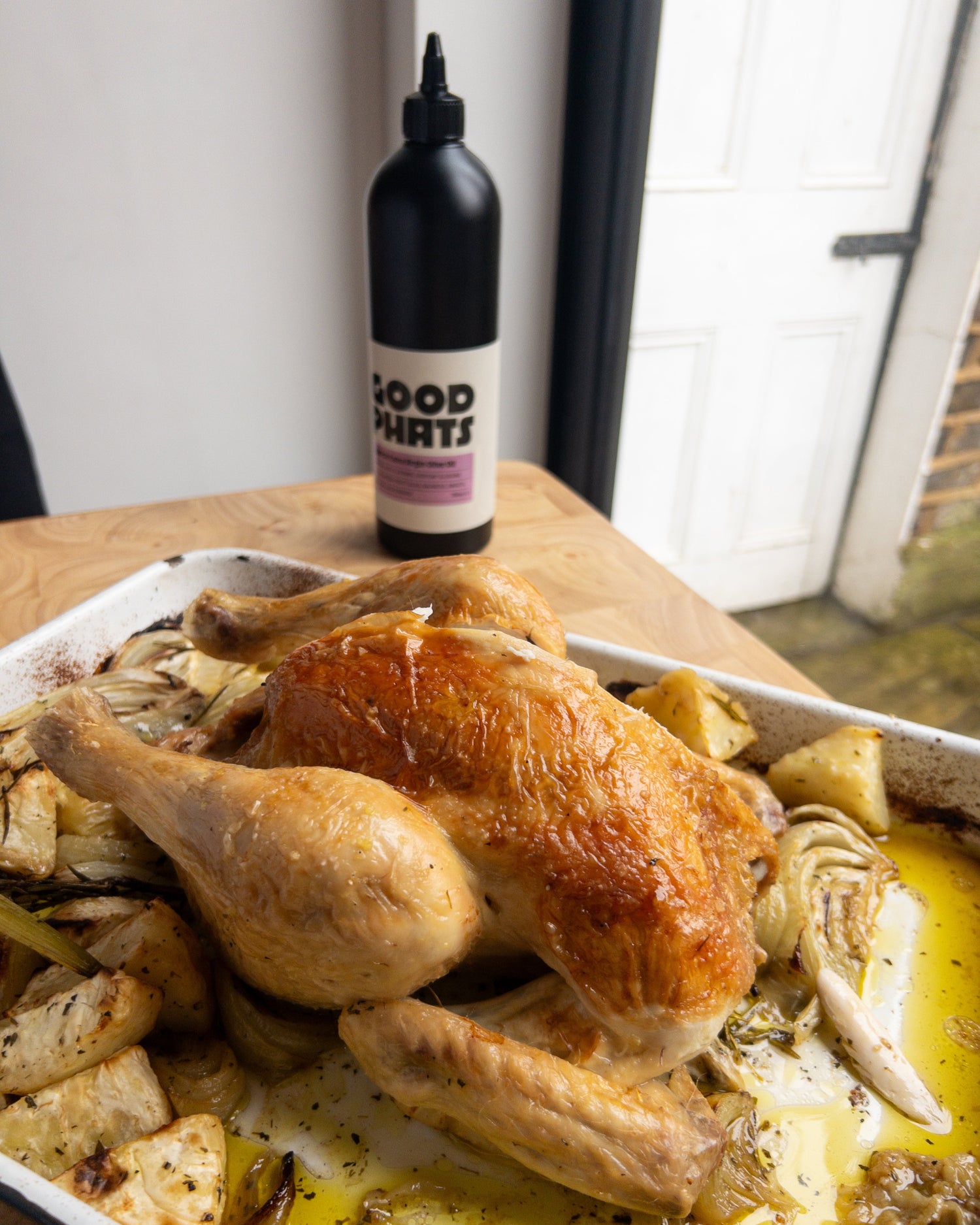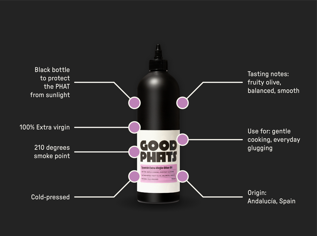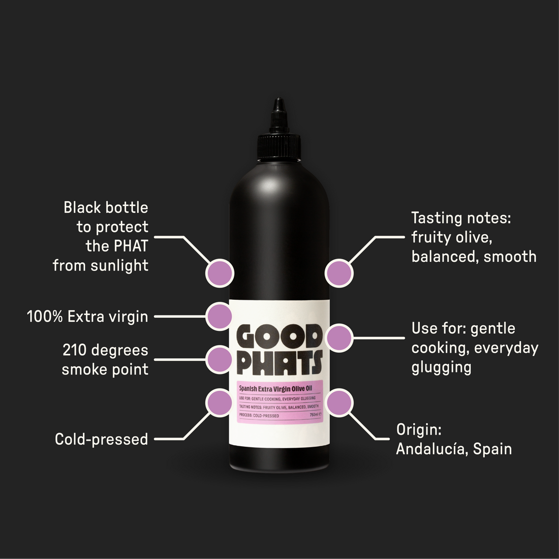 GOOD PHATS Spanish Extra Virgin Olive Oil is now available in a 750ml squeezy bottle! Douse into shakshuka or drizzle with precision into a salsa verde. With a fruity, rounded flavour & low-medium smoke point (21O°C), this oil is your everyday go-to for everything.